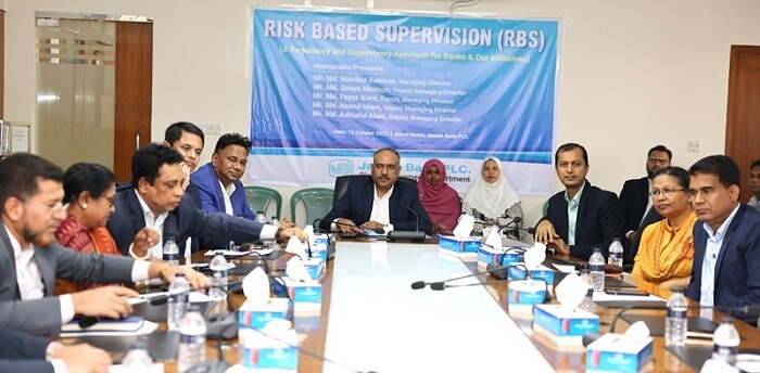 ১৫ অক্টোবর ২০২৫ সোমবার রিস্ক বেইজড সুপারভিশন (আরবিএস) কার্যক্রম বাস্তবায়নে প্রস্তুতি, সচেতনতা ও সক্ষমতা বৃদ্ধি ইত্যাদি বিষয়ে একটি সভা জনতা ব্যাংক পিএলসির প্রধান কার্যালয়ের বোর্ড রুমে অনুষ্ঠিত হয়। জনতা ব্যাংকের ব্যবস্থাপনা পরিচালক মোঃ মজিবর রহমানের সভাপতিত্বে অনুষ্ঠিত এ সভায় উপস্থিত ছিলেন ব্যাংকের উপব্যবস্থাপনা পরিচালক মোঃ ফয়েজ আলম, মোঃ নজরুল ইসলাম এবং মোঃ আশরাফুল আলম। এছাড়া সংশ্লিষ্ট মহাব্যবস্থাপক, উপমহাব্যবস্থাপক ও অন্যান্য নির্বাহীবৃন্দ উপস্থিত ছিলেন। সভায় ব্যাংকের রিস্ক ম্যানেজমেন্ট ডিপার্টমেন্টের উপমহাব্যবস্থাপক সঞ্জয় কুমার সরদার লিখিত প্রতিবেদন উপস্থাপন করেন।