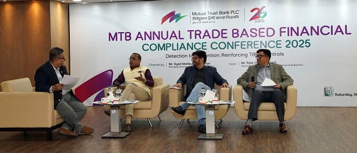 ট্রেড–বেইজড মানি লন্ডারিং প্রতিরোধে গুরুত্বপূর্ণ করণীয় বিষয়ে সচেতনতা বৃদ্ধির লক্ষ্যে মিউচুয়াল ট্রাস্ট ব্যাংক পিএলসি (এমটিবি) ডিসেম্বর ৬, ২০২৫ তারিখে ‘এমটিবি বার্ষিক ট্রেড–বেইজড ফিন্যান্সিয়াল কমপ্লায়েন্স কনফারেন্স–২০২৫’ আয়োজন করে। এমটিবির শাখা ও করপোরেট হেড অফিসে কর্মরত ট্রেড–সার্ভিসিং–সংশ্লিষ্ট কর্মকর্তাদের অংশগ্রহণে দিনব্যাপী এ সম্মেলন অনুষ্ঠিত হয়।