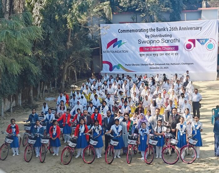 ব্যাংকের ২৬তম প্রতিষ্ঠাবার্ষিকী উপলক্ষে এমটিবি ফাউন্ডেশন চট্টগ্রাম বিভাগের বিভিন্ন স্কুলের সুবিধাবঞ্চিত মেধাবী ছাত্রীদের মাঝে বিনামূল্যে সাইকেল বিতরণ করেছে। ‘স্বপ্নসারথি (দ্য ড্রিম চ্যারিয়ট)’ কর্মসূচির আওতায় আয়োজিত এ উদ্যোগের মূল প্রতিপাদ্য— “স্কুলে যেতে দূরত্ব যেন বাধা না হয়”—এর মাধ্যমে শিক্ষার্থীদের স্কুলে যাতায়াতে ভৌগোলিক প্রতিবন্ধকতা দূর করার লক্ষ্য নেওয়া হয়েছে। এই উদ্যোগের মাধ্যমে এমটিবি ফাউন্ডেশন টেকসই উন্নয়ন লক্ষ্যমাত্রা ৩, ৪, ৫ এবং ১০ অর্জনে সহায়তার অঙ্গীকার পুনর্ব্যক্ত করেছে।