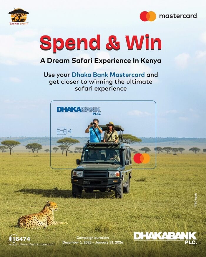 ঢাকা ব্যাংক এবং মাস্টারকার্ড যৌথভাবে তাদের কার্ডহোল্ডারদের জন্য এক আকর্ষণীয় শীতকালীন ক্যাম্পেইন ‘স্পেন্ড অ্যান্ড উইন’ চালু করার ঘোষণা দিয়েছে। এই ক্যাম্পেইনের আওতায় ঢাকা ব্যাংক মাস্টারকার্ড ব্যবহারকারীরা কেনাকাটা করে জিতে নিতে পারেন দারুণ সব পুরস্কার, যার মধ্যে গ্র্যান্ড প্রাইজ হিসেবে থাকছে কেনিয়ায় একটি কাপল ট্যুর (যুগল ভ্রমণ)।