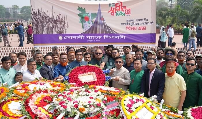 যথাযোগ্য মর্যাদায় মহান স্বাধীনতা ও জাতীয় দিবস-২০২৬ উদযাপন করেছে সোনালী ব্যাংক পিএলসি। ২৬ মার্চ, বৃহস্পতিবার ব্যাংকের এমডি অ্যান্ড সিইও মো. শওকত আলী খানের নেতৃত্বে সাভারে জাতীয় স্মৃতিসৌধে পুষ্পস্তবক অর্পণের মাধ্যমে জাতির শ্রেষ্ঠ সন্তান বীর শহীদদের স্মৃতির প্রতি শ্রদ্ধা নিবেদন করা হয়।